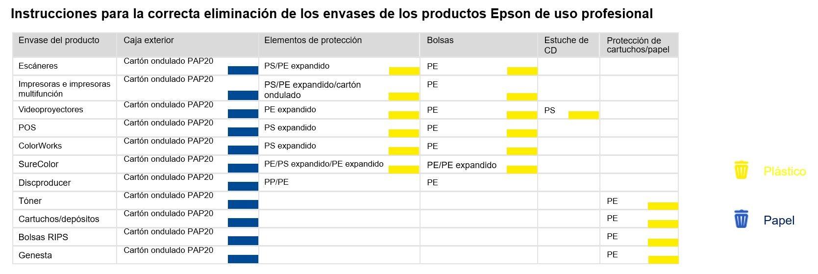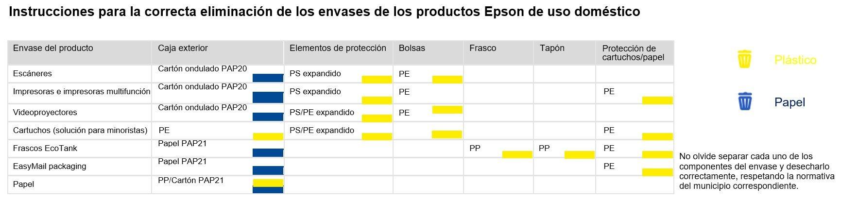 Los clientes particulares deben reciclar los embalajes separándolos según los materiales respectivos (por ejemplo, cajas de cartón en papel usado). En general, los embalajes se reciclan como parte de los sistemas de recogida y reciclaje domésticos organizados por los ayuntamientos. Para indicaciones sobre la fracción o contenedor en la que deben depositarse los residuos de envases domésticos procedentes de productos Epson consultar en el propio envase o en las instrucciones indicadas en esta web.