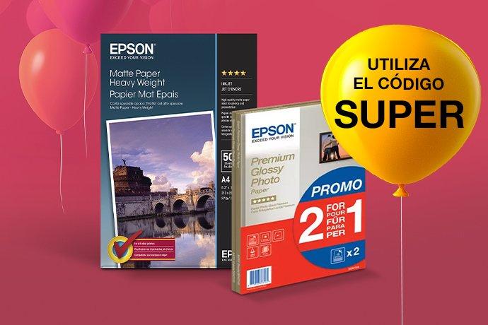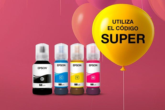 1 Código de cupón válido hasta la medianoche del 24 de mayo de 2026. Introduce “SUPER” para conseguir un 10 % de descuento en determinadas botellas de tinta EcoTank, un 15 % de descuento en determinados multipacks de cartuchos de tinta y packs de cartuchos de tinta individuales; y un 33 % de descuento en algunos papeles. Las tintas y papeles de la promoción se identifican con las insignias promocionales "UTILIZA EL CÓDIGO SUPER"